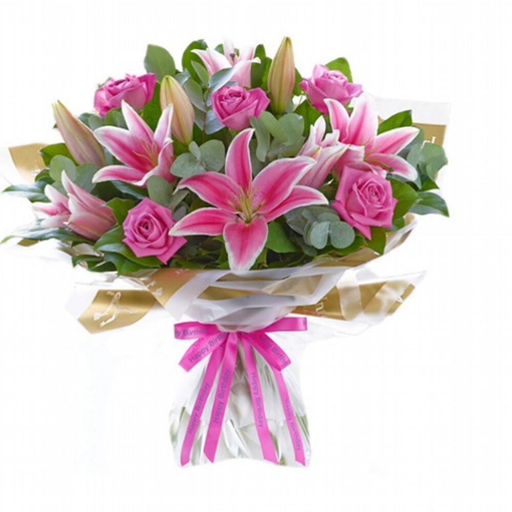 embalagem - 1 un. laço - 1 un. lírio - 1 un. folhagens e complementos - 1 un. rosa nacionais na cor rosa - 6 un.