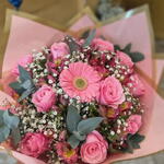 rosa - 12 un. gerbera - 1 un. embalagem - 1 un. folhagem - 5 un. laço - 1 un. chuva de prata - 3 un.