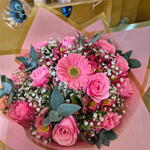 Este é um buquê de rosas deslumbrante, meticulosamente projetado com 12 rosas vibrantes e ornamentado com uma gerbera graciosa no centro. Cercado por 5 folhagens verdes luxuriantes e acrescido por 3 delicados ramos de chuva de prata, esta composição adquire ainda mais encanto. O arranjo é cuidadosamente embalado em uma bela embalagem e finalizado com um laço elegante, tornando-o o presente perfeito para qualquer ocasião.