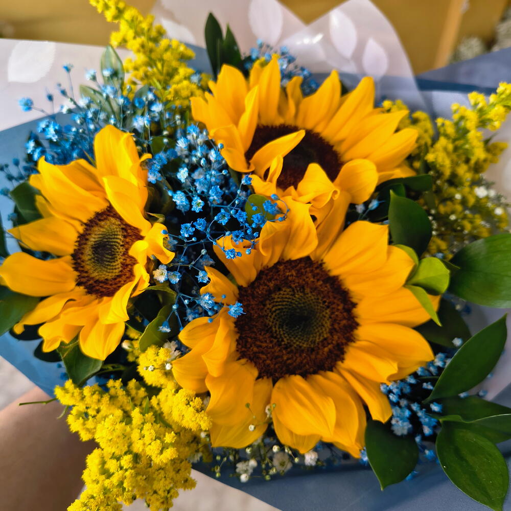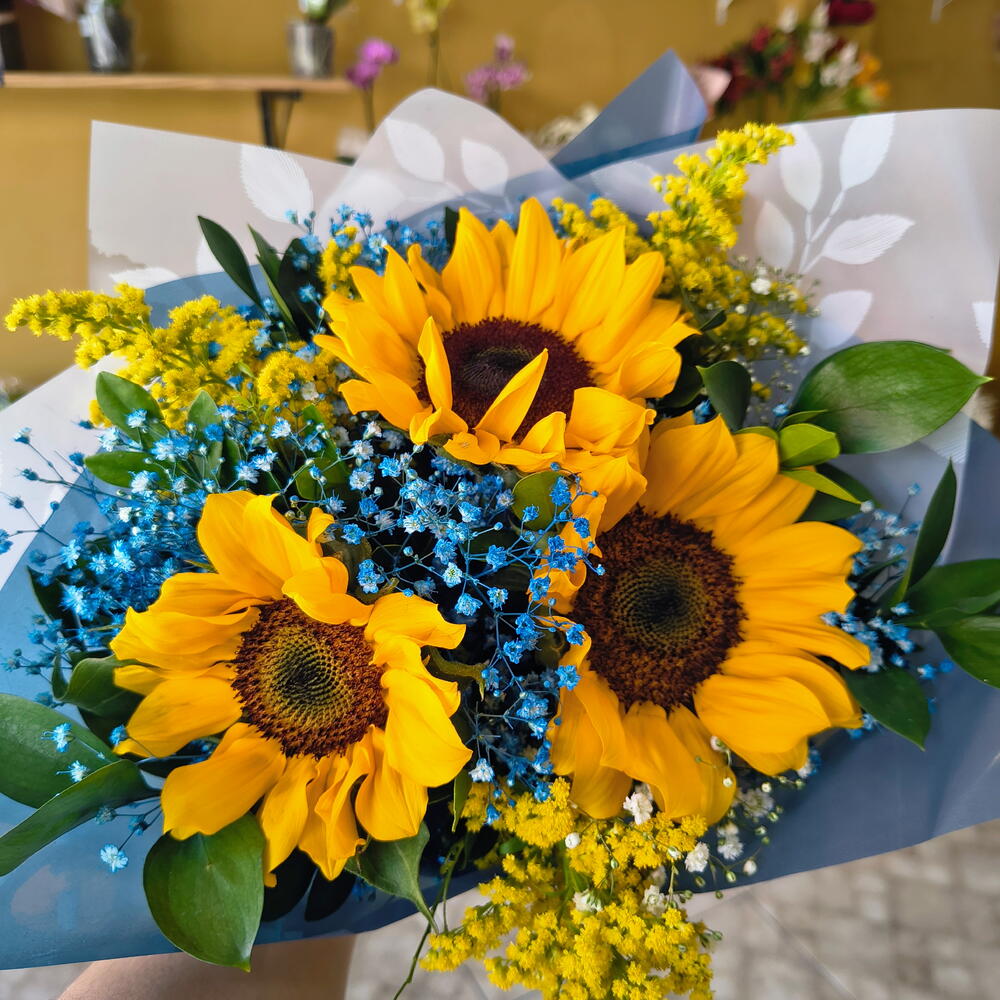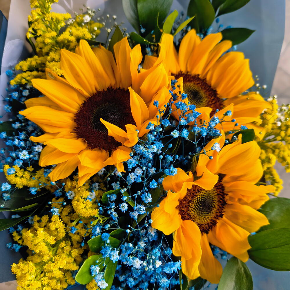 Adicione um pouco de luz e alegria ao seu dia com este maravilhoso buquê de girassóis. Este buquê, cuidadosamente arranjado com 3 girassóis brilhantes, é complementado por 5 delgados galhos de Tango, criando um contraste magnífico e cativante. E para um toque final de brilho e delicadeza, adicionamos 5 unidades de Chuva de Prata Azul. Este bouquet magnífico vem aconchegado em uma embalagem elegante com um laço encantador. Seja para um presente especial ou simplesmente para alegrar a sua casa, este bouquet não desaponta.
