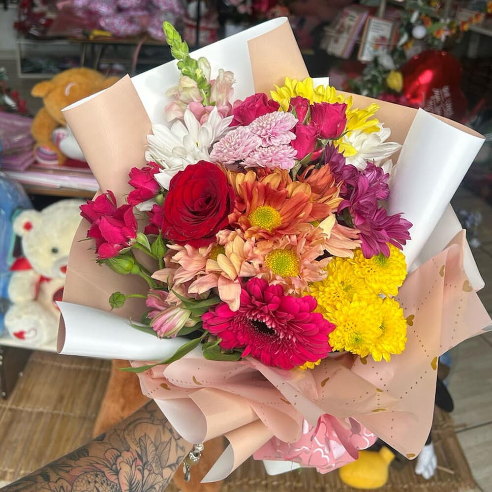 Um arranjo alegre e vibrante, composto por flores variadas em cores harmoniosas que transmitem leveza e boas energias. Perfeito para celebrar momentos especiais, desejar felicidades ou simplesmente iluminar o dia de alguém querido com um presente cheio de vida, charme e delicadeza.