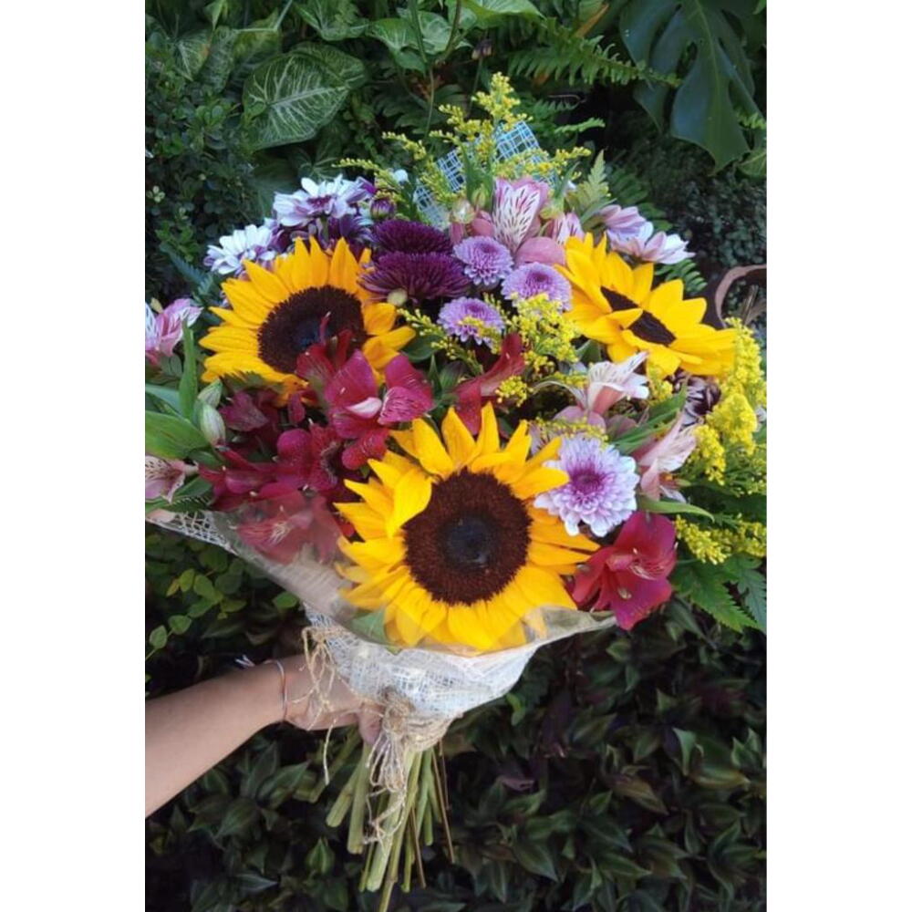 embalagem - 1 un. laço - 1 un. folhagens e complementos - 1 un. flores mistas coloridas - 12 un.