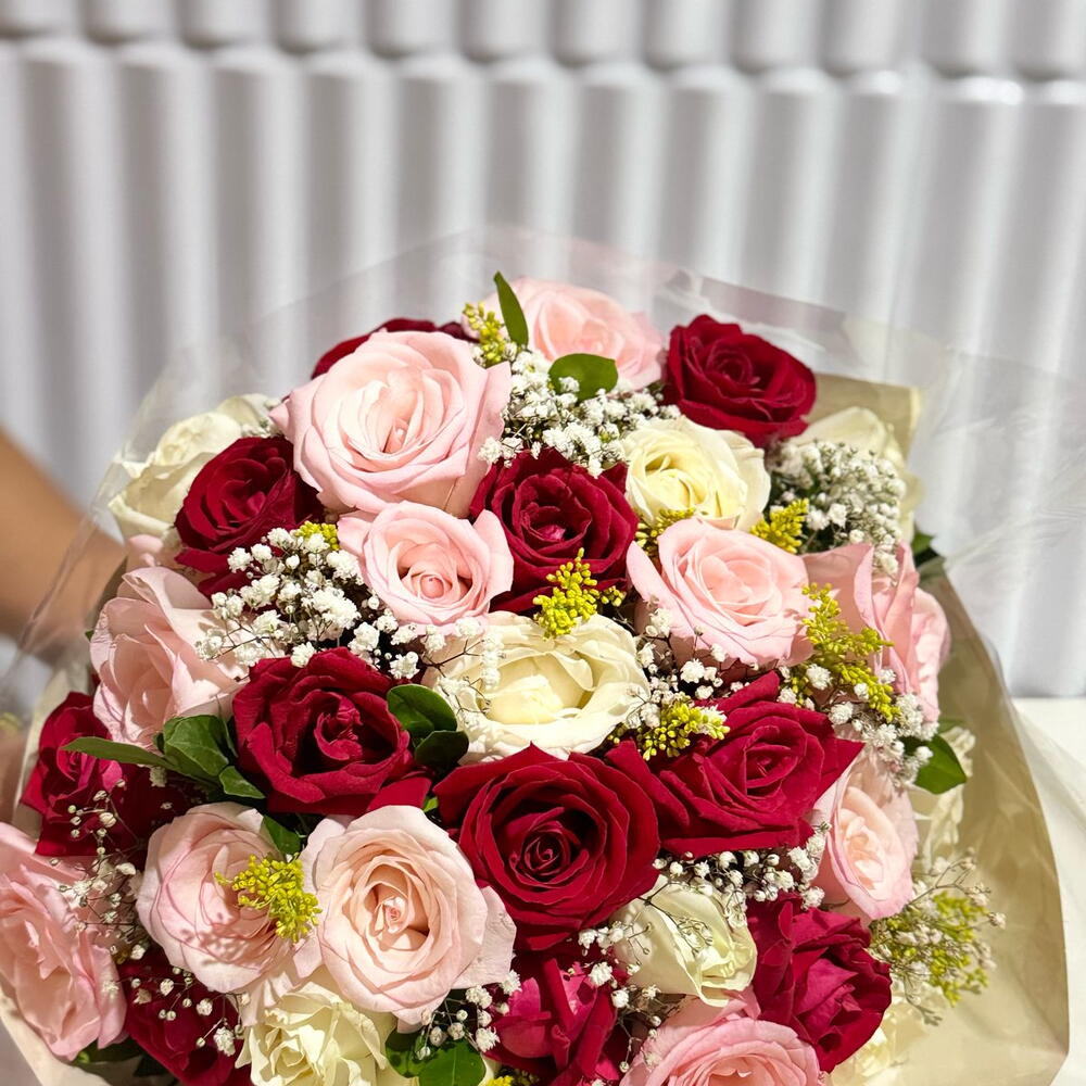 Esta incrível combinação de buquê é uma verdadeira expressão de requinte e elegância. Composto por 10 unidades de rosas brancas, simbolizando a pureza, 10 unidades de rosas vermelhas evocando uma paixão ardente e 10 unidades de rosas rosadas para trazer lustro e delicadeza ao conjunto. O buquê é complementado por uma unidade de atraentes folhagens e itens complementares para aprimorar sua beleza. Embalado de forma sofisticada, este buquê é uma opção perfeita para expressar um gesto de amor, apreço ou até mesmo para apreciar a simplicidade eterna de uma flor.