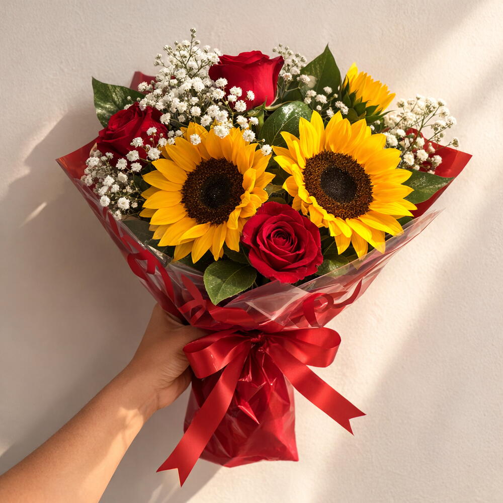 Este buquê único, feito com elegância e bom gosto, é composto por rosas colombianas e girassóis, criando um jogo cromático impressionante. O conjunto de quatro folhagens acrescenta frescor e vitalidade ao buquê, enquanto a embalagem cuidadosamente selecionada serve como pano de fundo para destacar a beleza destas flores. O toque final é um laço, que amarra tudo com sofisticação e classe. Uma proposta floral realmente atraente para qualquer ocasião.