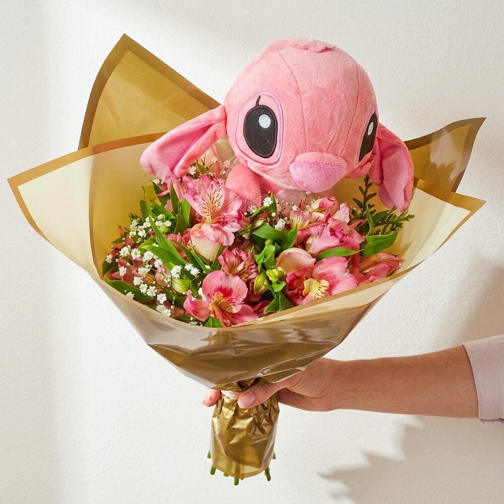embalagem - 1 un. folhagens - 1 un. laço - 1 un. pelúcia angel - 1 un. astroméria rosadas - 15 un.