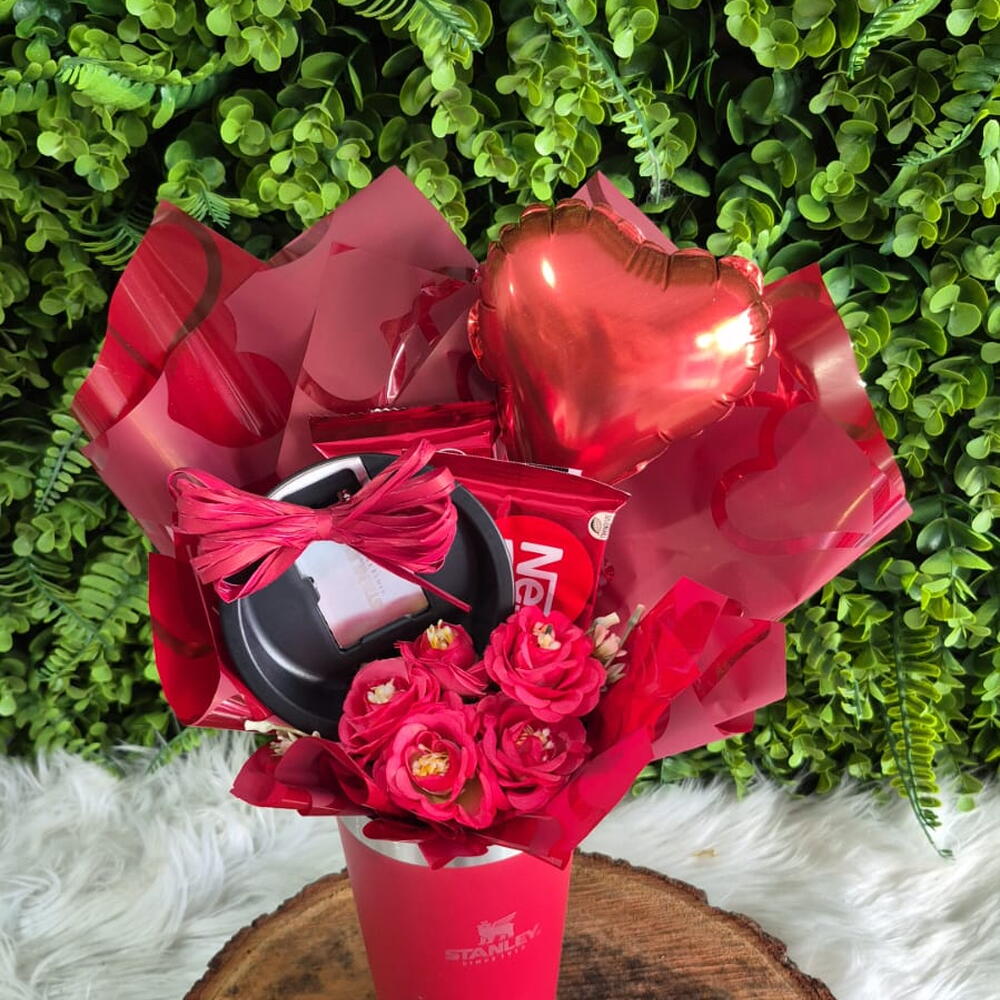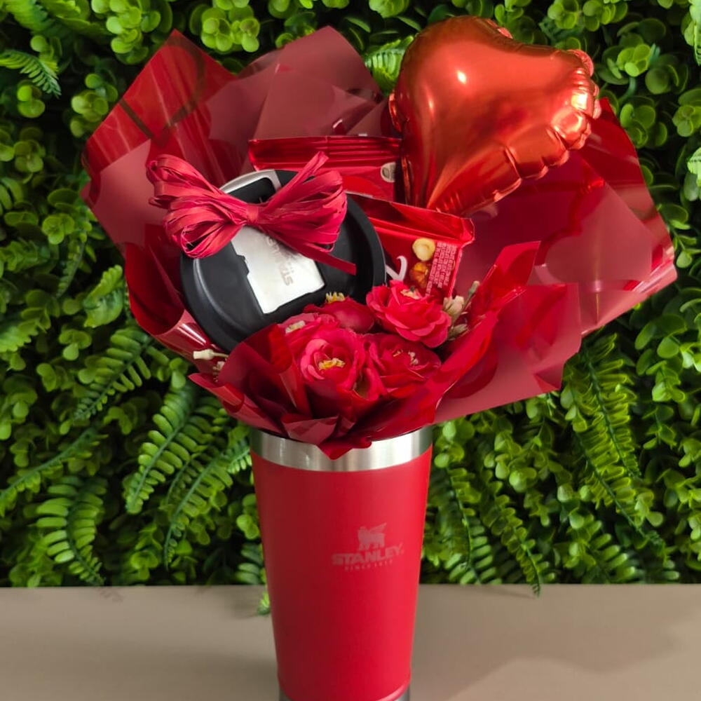 Surpreenda quem você ama com um presente que une charme, sabor e emoção! 💖 Nosso Buquê na Copo Stanley é a combinação perfeita para encantar em qualquer ocasião especial. Ele traz um lindo copo térmico Stanley na cor vermelha, acompanhada por delicadas flores em tons apaixonantes, chocolates irresistíveis e um balão metalizado em formato de coração que deixa o momento ainda mais especial. Além de ser um presente criativo e sofisticado, o copo é super funcional, ideal para manter bebidas quentes ou geladas por muito mais tempo — uma lembrança útil que vai marcar presença no dia a dia de quem recebe. Perfeito para Dia dos Namorados, aniversário, pedido especial ou simplesmente para dizer “eu te amo” de um jeito inesquecível. ❤️ Encante, emocione e Impressione! 💐✨
