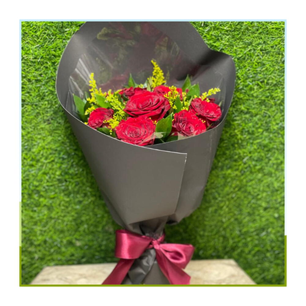 tango - 1 un. folhagens - 1 un. rosa vermelhas - 7 un. laço em cetim - 1 un. embalagem moderna - 1 un.