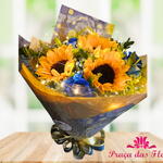 Buque Lindo inspirado na obra de arte Noite Estrelada do Pintor VanGogh. Buque composto por Girassol Rosas azul, folhagens nobre e com led representando as estrelas. embalagem combinando e com imagem da obra de arte impressa. e com lindo laço.