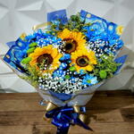 embalagem de designer - 1 un. girassol - 3 un. gypsofila - 2 un. laço - 1 un. cartão de mensagem - 1 un. flores do campo hastes - 4 un. folhagens e complementos - 4 un. arte em papel cartão - 1 un.