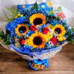girassol - 4 un. rosa vermelhas - 4 un. cartão de mensagem - 1 un. folhagens e complementos - 4 un. tango hastes - 2 un. flores do campo amarelas e azuis - 8 un. gipsofila branca e azul - 4 un. arte noite estrelada impressa - 1 un.