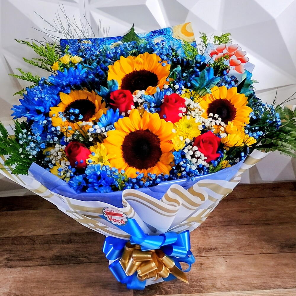 girassol - 4 un. rosa vermelhas - 4 un. cartão de mensagem - 1 un. folhagens e complementos - 4 un. tango hastes - 2 un. flores do campo amarelas e azuis - 8 un. gipsofila branca e azul - 4 un. arte noite estrelada impressa - 1 un.