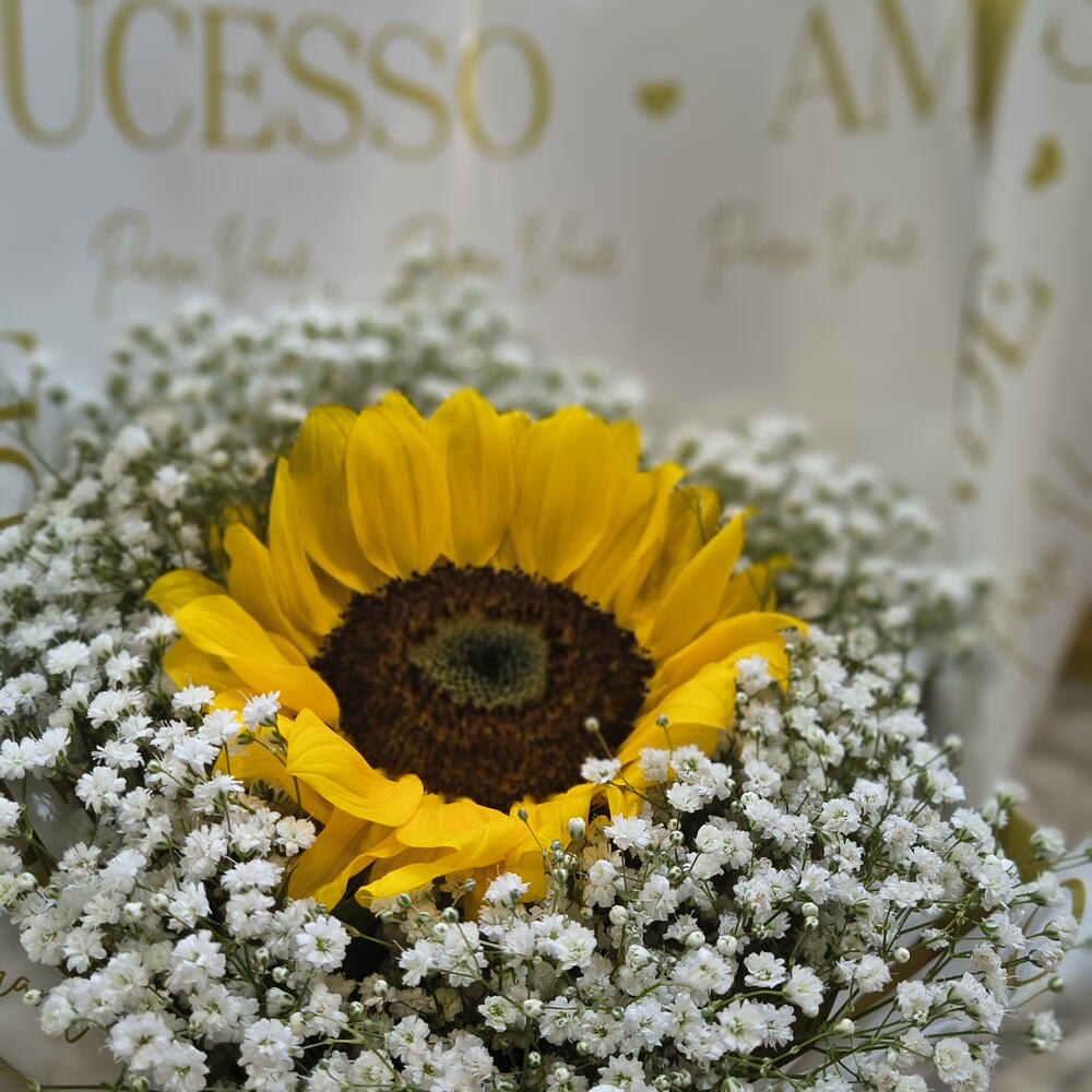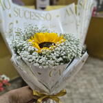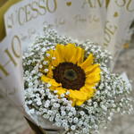 Este encantador buquê apresenta um solitário e majestoso girassol, rodeado por cinco unidades deslumbrantes de chuva de prata. Cuidadosamente embalado em uma bela embalagem e finalizado com um laço de cetim, este buquê é um presente perfeito para alegrar o dia de alguém especial.