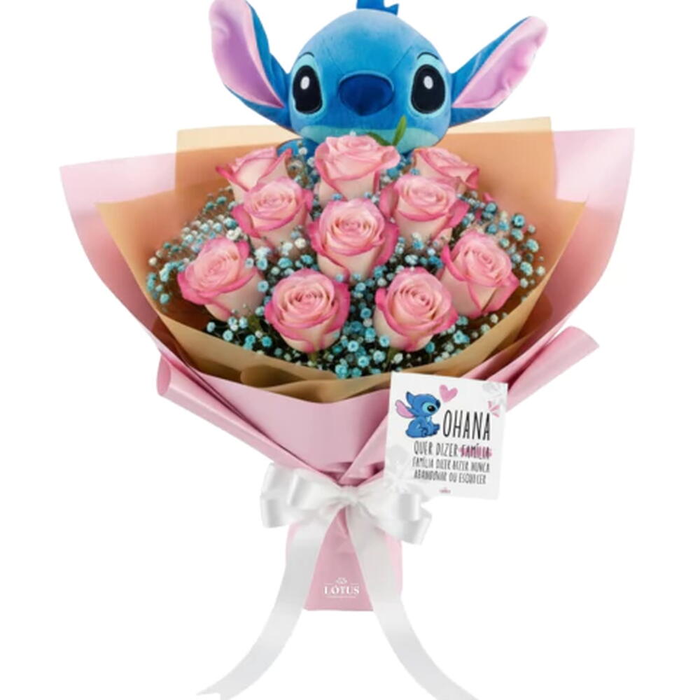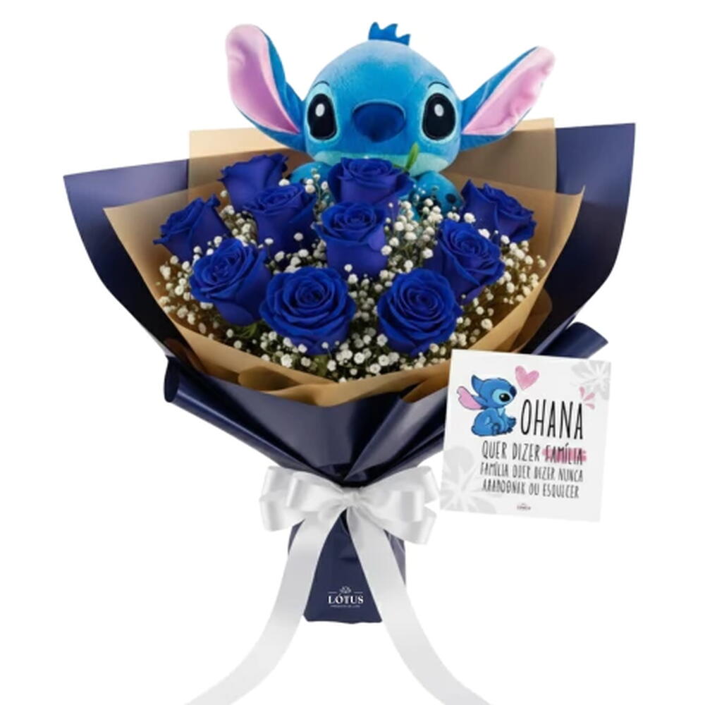 Quem nunca se emocionou com esse trecho do filme Lilo Stitch que atire a primeira flor. Um lindo presente para você arrancar um ooooooun...! de quem o receber, o Buquê Ohana é composto por rosas cor de rosas, mosquitinhos azuis e uma linda pelúcia de 20 cm do Stitch. Em uma embalagem linda para presente nas cores azul e rosa e para finalizar um cartãozinho com a mensagem: Ohana quer dizer família. Família quer dizer nunca abandonar ou esquecer.