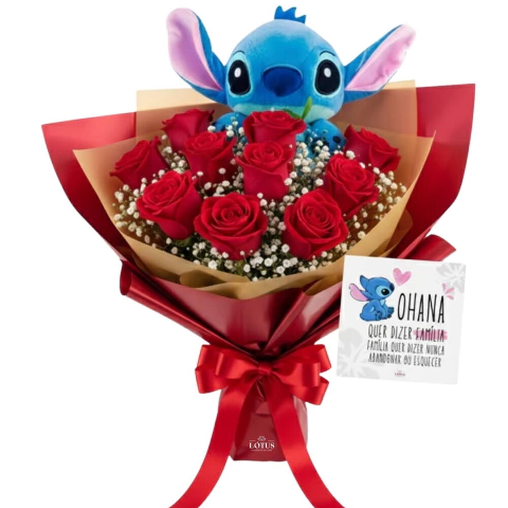 embalagem - 1 un. folhagens - 1 un. laço - 1 un. pelucia stitch 20cm - 1 un. cartãozinho ohana - 1 un. rosa (escolha a cor) - 10 un.