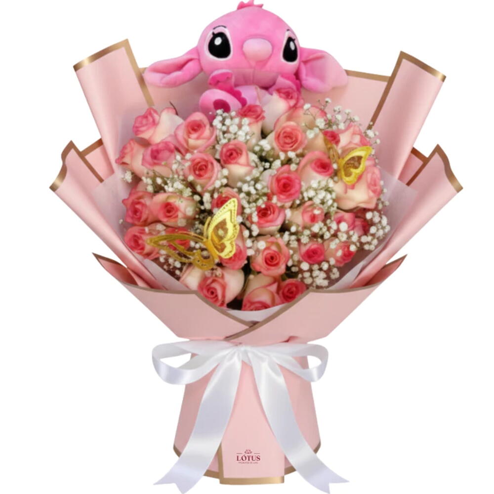 Este lindíssimo buquê é a combinação perfeita de elegância e ternura. Composto por 36 rosas cor de rosa, proporciona um ar de sofisticação e graça, enquanto a pelúcia de anjo adiciona um toque de doçura e carinho. Adornado ainda com delicados mosquitinhos e duas etiquetas de borboletas, o que eleva a sutileza do conjunto. Finalizado com um laço e envolto numa embalagem moderna, este buquê está pronto para ser o presente ideal para demonstrar seu carinho e afeto.
