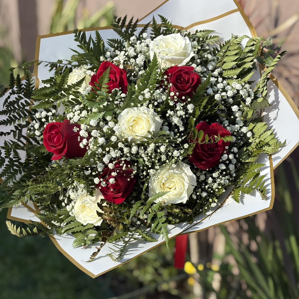 Este lindo buquê é composto por 5 rosas brancas e 5 rosas vermelhas, delicadamente arranjadas com folhagens e complementos. O acentuado toque final vem com um elegante laço que envolve o conjunto. Acompanha três unidades de nossa premium embalagem presenteável, tornando-o a opção perfeita para uma lembrança inesquecível.