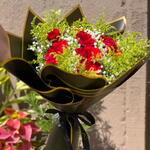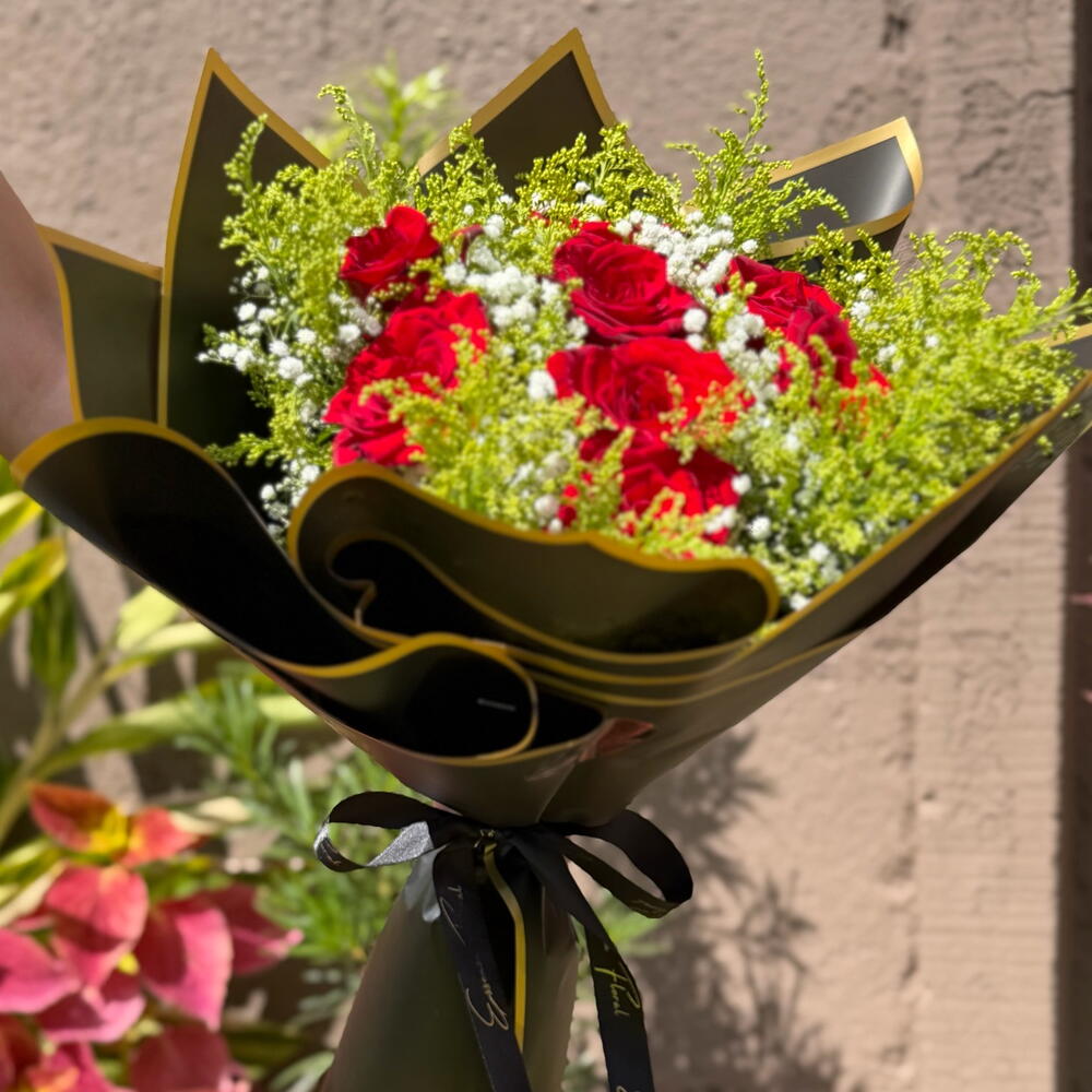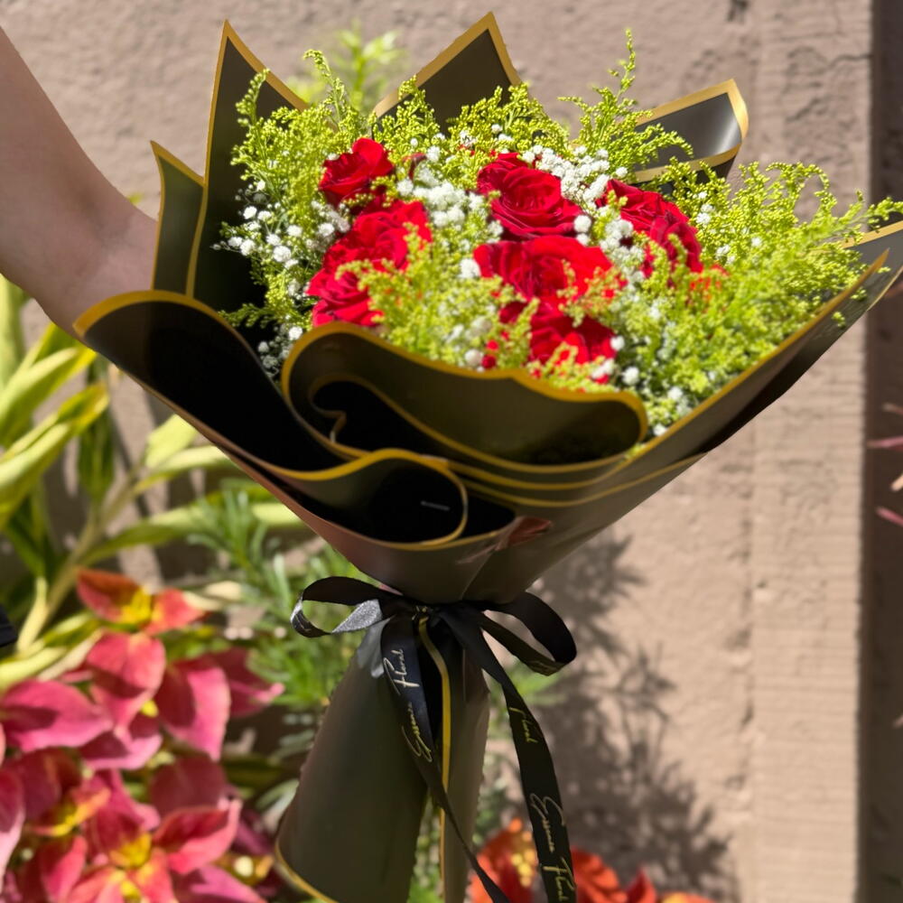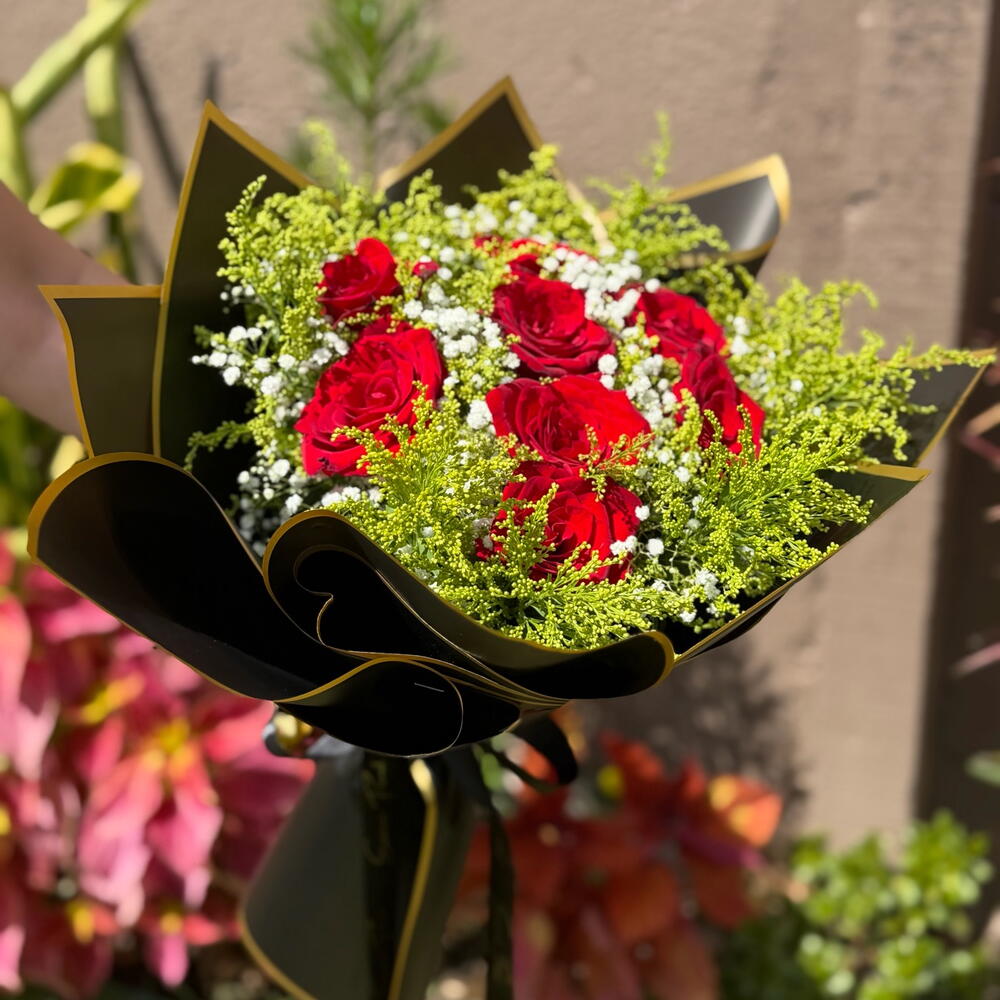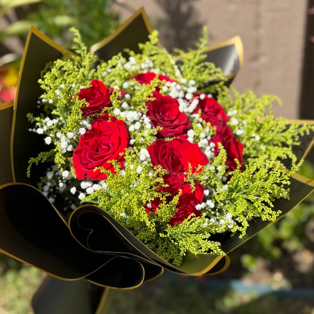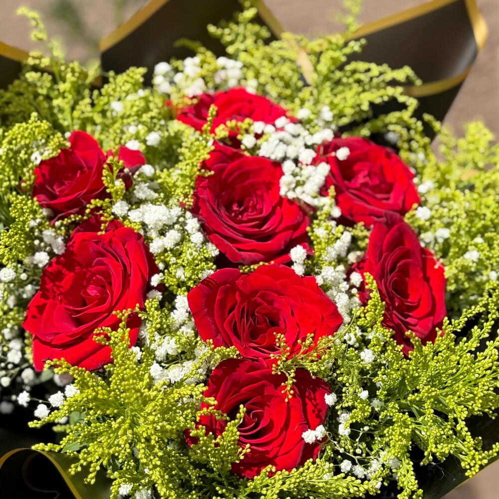 Este buquê exuberante é composto por oito rosas vermelhas apaixonantes, escolhidas a dedo pela sua beleza e frescor. Fica ainda mais destacado com um laço grande, elegante e requintado, que adiciona um toque de majestosidade ao arranjo. A combinação é harmonizada com encantadoras folhas e complementos, cuidadosamente arranjados para aperfeiçoar a apresentação. Tudo isto é envolvido em uma luxuosa embalagem premium, que aumenta o seu charme e torna-o um presente perfeito. A sua quantidade confirma o elevado padrão deste buquê, tornando-o uma escolha adorável para expressar o seu amor, gratidão ou carinho de uma forma elegante e sofisticada.