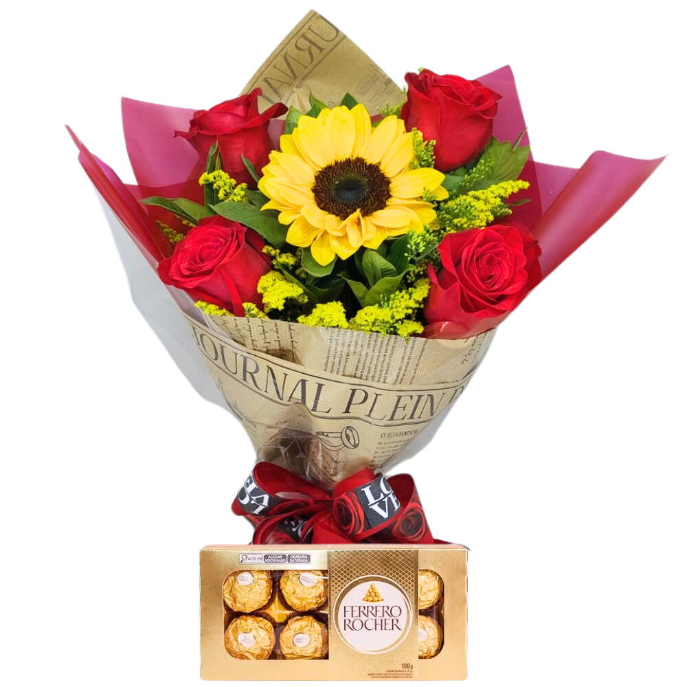 girassol - 1 un. rosa vermelhas - 4 un. chocolate ferrero rocher com 8 unidades - 1 un. embrulho elegante com laço - 1 un.