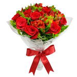 embalagem - 1 un. folhagens - 1 un. laço em cetim - 1 un. rosa vermelhas e astromelias - 1 un.