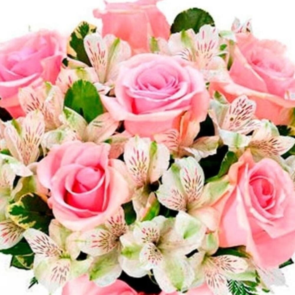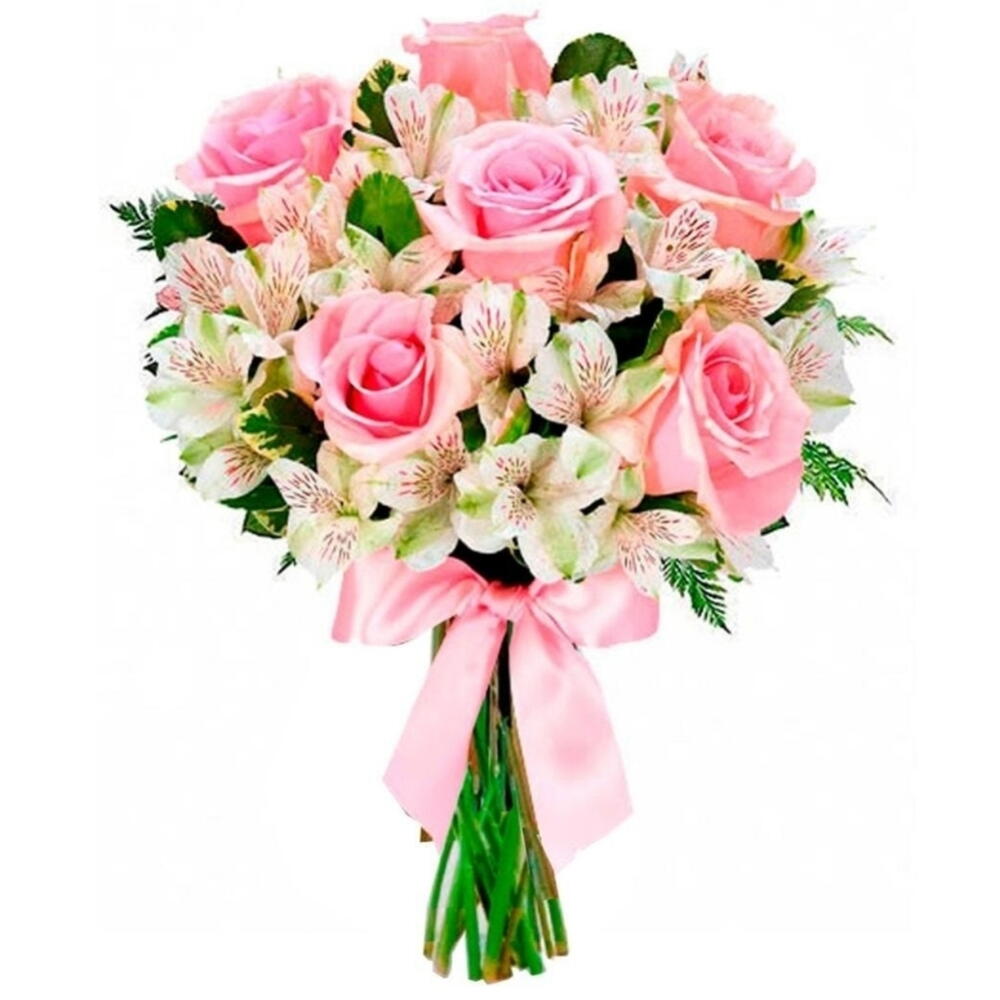 folhagem - 1 un. rosa rosadas - 6 un. laço especial - 1 un. celofane embalagem - 1 un. astroméria brancas maço - 1 un.