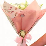 Admire este encantador buquê composto por 10 deslumbrantes rosas brancas, delicadamente acentuado com folhagens frescas e complementos que realçam a luminosidade das flores. Cada buquê é cuidadosamente acomodado em uma embalagem elegante e finalizado com um laço delicado, tornando-o o presente perfeito para qualquer ocasião.