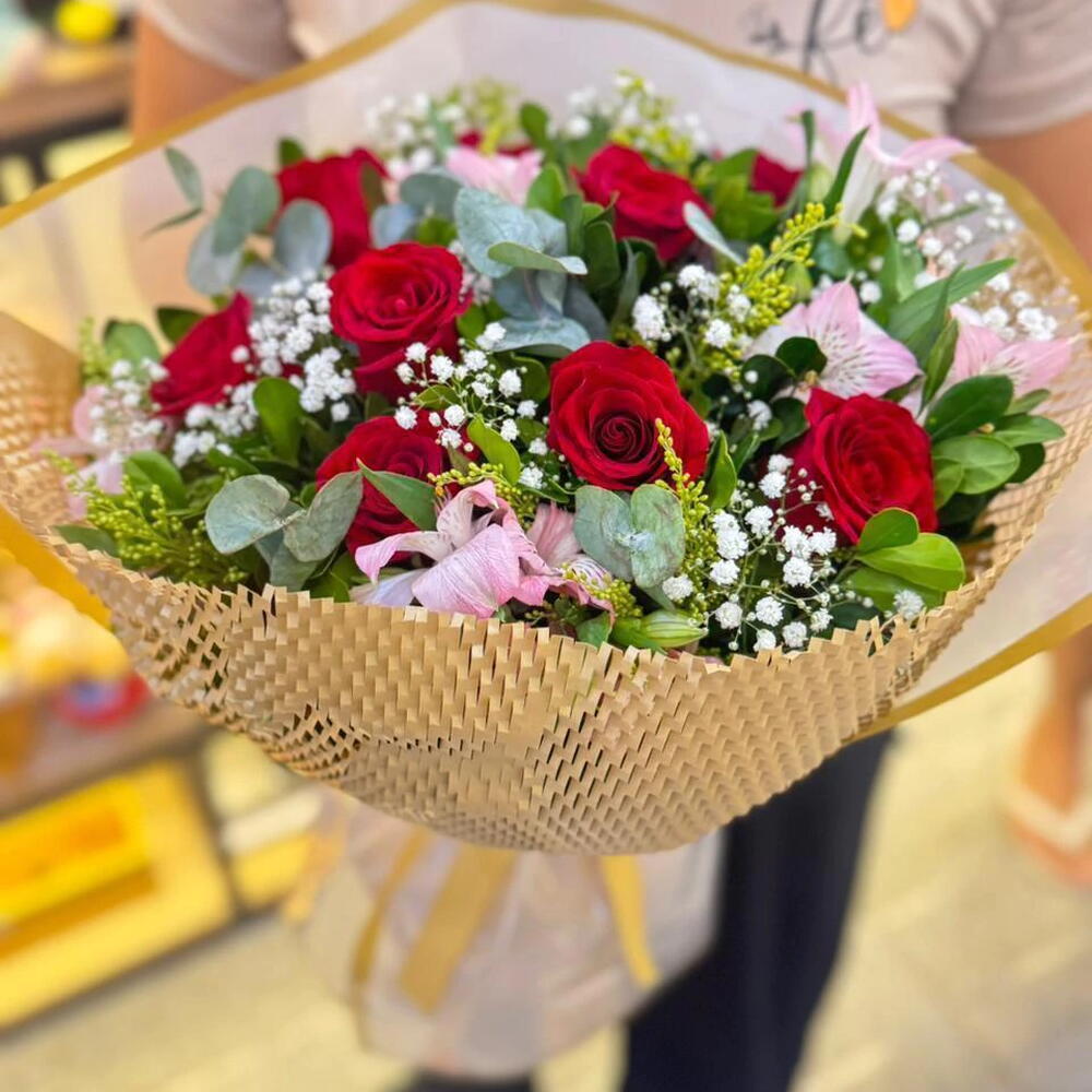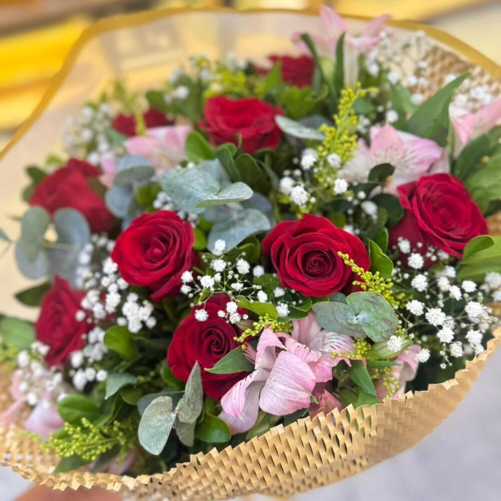 Um clássico que nunca sai de moda. O Buquê Realeza reúne 12 rosas vermelhas intensas, símbolo de amor eterno, acompanhadas de delicadas flores do campo e folhagens selecionadas. Sua embalagem romântica com detalhes de corações e laço de cetim torna esse arranjo ainda mais encantador e sofisticado. Perfeito para surpreender em datas especiais como aniversários, pedidos de namoro, bodas ou simplesmente para declarar amor de forma inesquecível. 🌹 Significado: as 12 rosas representam a completude do amor, a intensidade dos sentimentos e a promessa de eternidade.