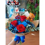 Este elegante kit de presente inclui um buquê deslumbrante composto por 4 rosas vermelhas, um mix de flores azuis, ramos frescos de eucalipto e aspargo. Acentuações charmosas não param por aí - um mini ursinho de chaveiro adiciona um toque adorável! A apresentação é incrivelmente sofisticada, com o embrulho Kraft Journal e finalizado com um laço azul. É o presente perfeito para expressar amor e apreciação.