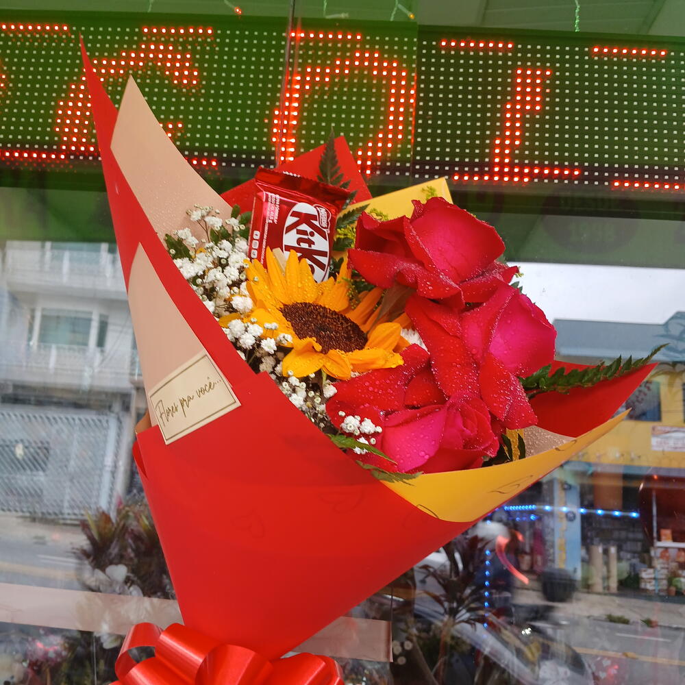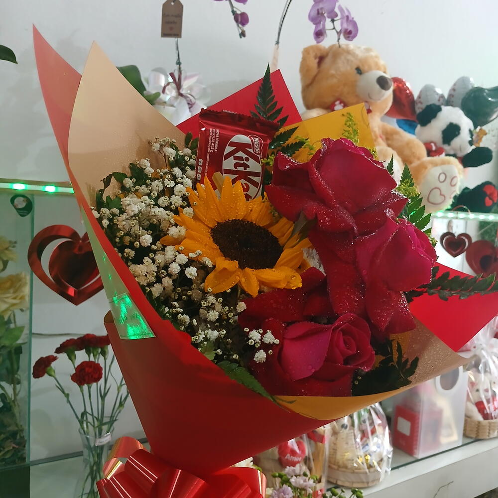 Este regalo delicioso y elegante reúne la belleza de la naturaleza con el sabor irresistible del chocolate. Compuesto por 6 unidades de delicada folhagem, 1 radiante girassol y 3 rosas importadas que aportan un toque de sofisticación. Como adición final, 1 lazo y 2 papeles satinados envuelven 1 chocolatina Kit Kat, mientras que 2 unidades de egypsofila aportan un toque delicado. Un regalo perfecto para satisfacer la pasión por el chocolate y la belleza en un solo paquete.