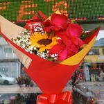 folhagem - 6 un. girassol - 1 un. chocolate kit kat - 1 un. laço - 1 un. rosa importada - 3 un. egypsofila - 2 un. papel acetinado - 2 un.