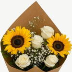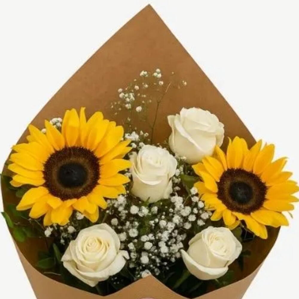Este irresistível buquê é composto por duas unidades de girassol natural vibrante, quatro unidades de sofisticadas rosas brancas nacionais e uma unidade de delicada folhagem natural. Belos mosquitinhos adicionam elegância e um toque de beleza suave. Tudo perfeitamente arranjado e amarrado com um lindo laço, e cuidadosamente embalado em uma embalagem de kraft. Este buquê é a expressão perfeita de amor, alegria e celebração. Uma belíssima opção de presente que vai, certamente, encantar quem o receber.