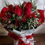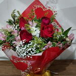 Um buquê encantador e cheio de significado, composto por três rosas vermelhas que simbolizam amor intenso e duradouro, acompanhadas por flores delicadas como astromélias rosadas, gipsofila branca e folhagens verdes que trazem frescor e elegância ao arranjo. O acabamento é feito com papel decorativo em vermelho vibrante, adornado por detalhes em formato de corações, transmitindo ainda mais romantismo.