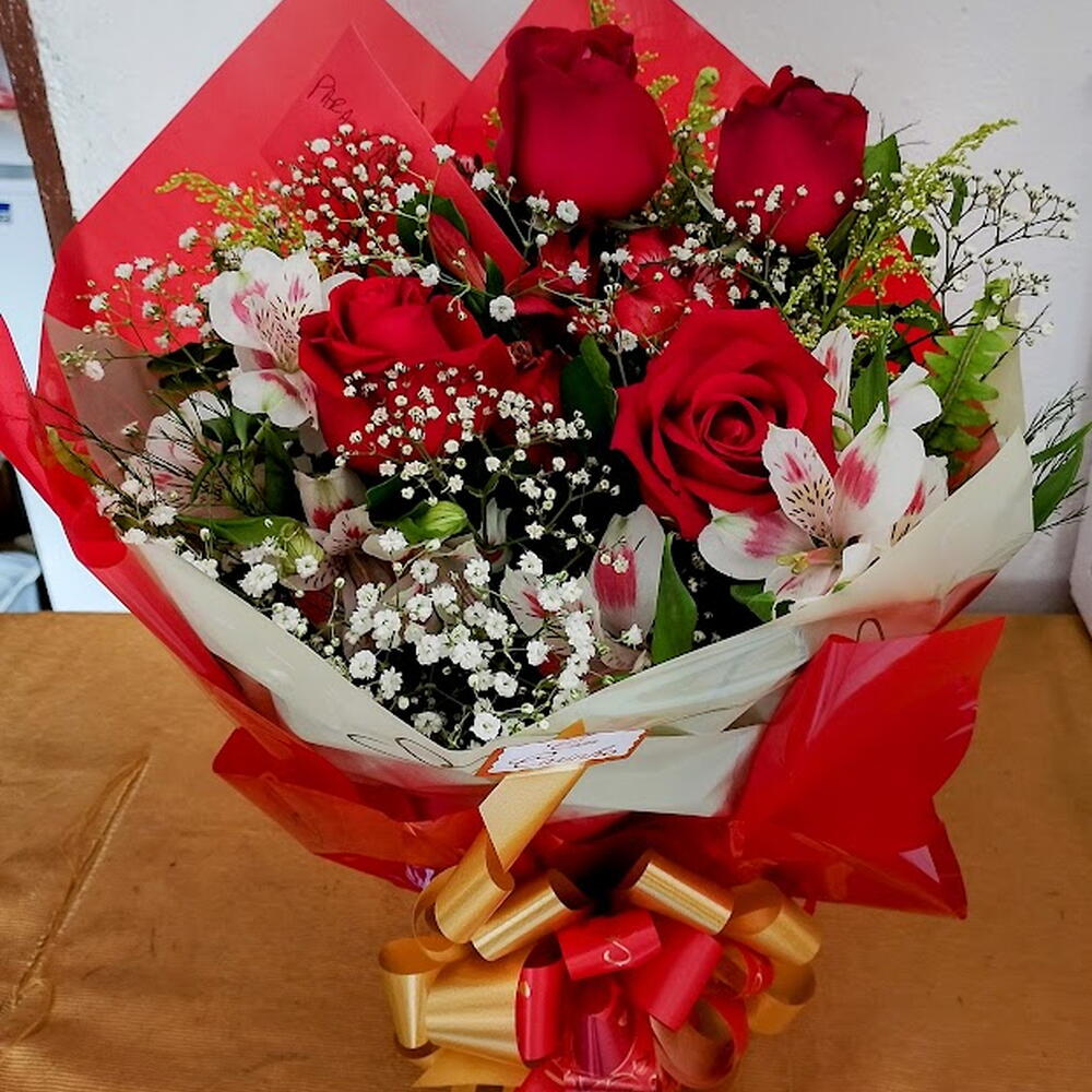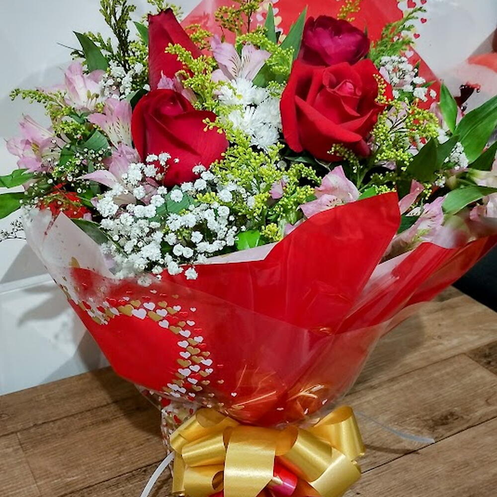 Um buquê encantador e cheio de significado, composto por três rosas vermelhas que simbolizam amor intenso e duradouro, acompanhadas por flores delicadas como astromélias rosadas, gipsofila branca e folhagens verdes que trazem frescor e elegância ao arranjo. O acabamento é feito com papel decorativo em vermelho vibrante, adornado por detalhes em formato de corações, transmitindo ainda mais romantismo.