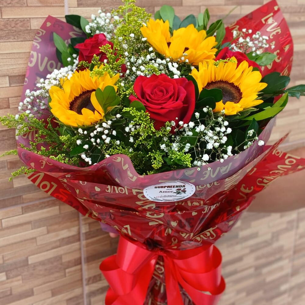 Encante-se com este buquê sofisticado e radiante. Composto com três rosas vermelhas, símbolos de amor e paixão, harmoniosamente emparelhadas com três girassóis, que representam felicidade e energia positiva. Esta combinação não só trará um toque de elegância e vivacidade, mas também transmitirá uma forte mensagem de carinho e admiração. Ideal para presentear quem você ama ou simplesmente para trazer um pouco de beleza ao seu dia.