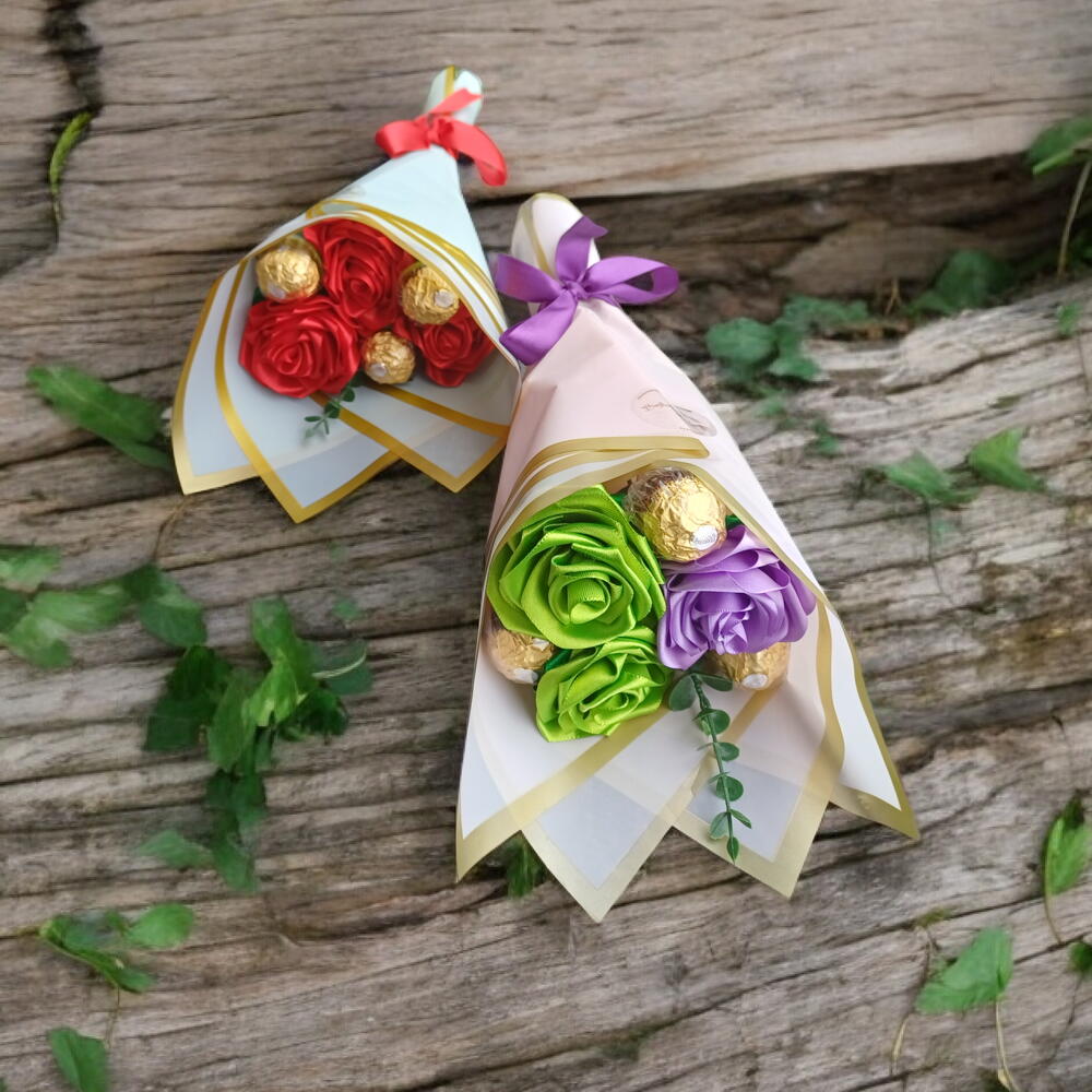 bombons ferrero rocher - 3 un. rosa de cetim - 3 un. poli coreano folha - 1 un.
