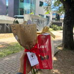 embalagem kraft - 1 un. rosa vermelhas naturais - 3 un. laço cetim - 1 un. chocolate belga importado 100g - 1 un.