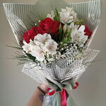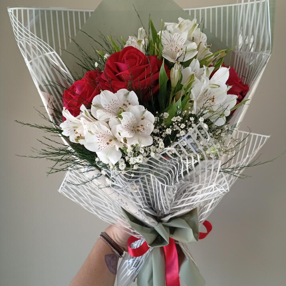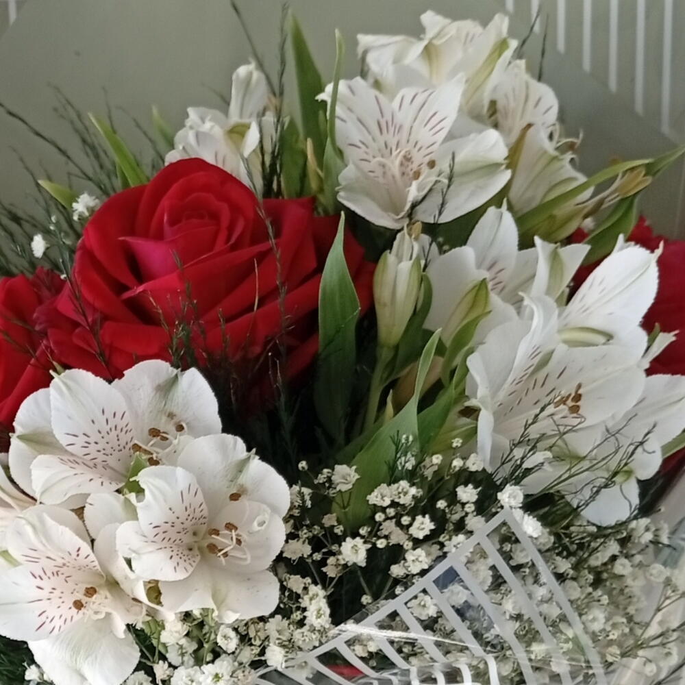 Este buquê exclusivo é uma combinação harmoniosa de 3 rosas vermelhas, 10 folhagens frescas e 3 delicados mosquitinhos. Enfatizando o seu charme estão 3 astroméria brancas ou margaridas, adicionando um toque de elegância contrastante. Este conjunto é habilmente atado com um laço de cetim suave e embalado em uma embalagem elegante da estação. Este buquê é verdadeiramente um tributo visual e sensorial ao amor e à beleza. Ideal para momentos especiais ou simplesmente para iluminar o dia de alguém.