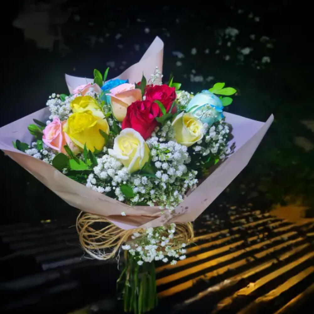 Buque com 12 rosas coloridas (azul, amarela, vermelha, branca) Acompanha cartinha com sua mensagem e plaquinha com foto ou nome uma combinação perfeita de sentimentos: a tranquilidade e a confiança do azul, a alegria do amarelo, a intensidade do vermelho e a pureza do branco. Ele simboliza o equilíbrio entre emoções profundas, harmonia, felicidade e sinceridade, sendo ideal para celebrar momentos especiais ou surpreender alguém com um gesto cheio de significado.