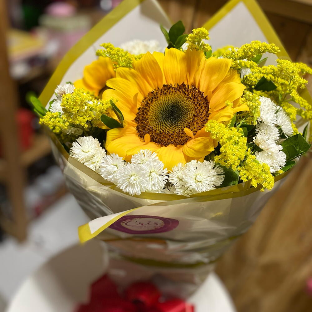 Este buquê, carinhosamente elaborado, apresenta uma composição única de dois girassóis vibrantes complementados por um arranjo floral meticulosamente disposto. As flores são majestosamente acondicionadas numa embalagem de design atraente, arrematada por um laço em cetim, conferindo um toque elegante e sofisticado. É um presente maravilhoso que cativa com sua beleza estonteante e sensação de alegria.