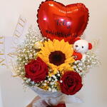 Um presente encantador que transmite alegria e carinho! Composto por um deslumbrante girassol, rosas vermelhas apaixonantes, delicadas gypsofilas, um ursinho fofo e um balão em formato de coração com “Feliz Aniversário”. Uma combinação perfeita de cores e emoções para celebrar o dia especial de quem você ama.