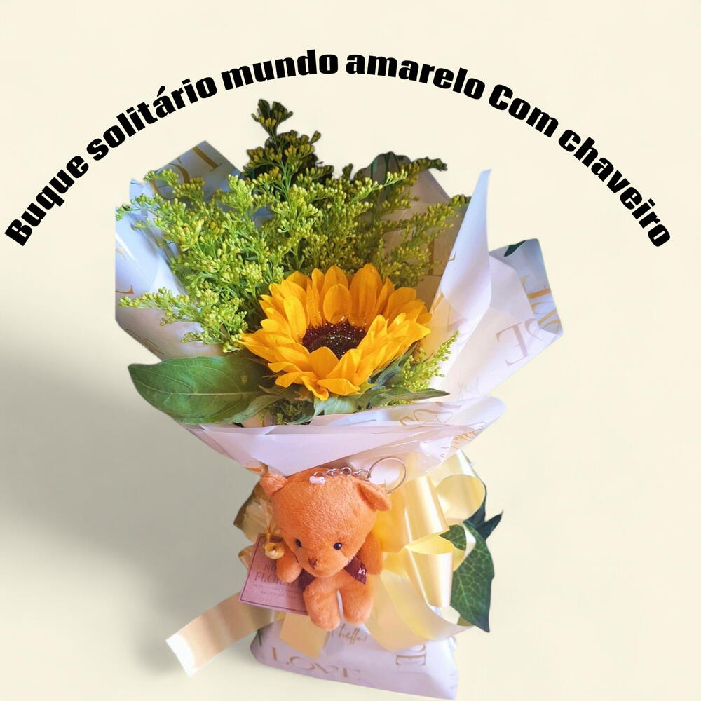 embalagem - 1 un. girassol - 1 un. laço - 1 un. laço borboleta - 1 un. chaveiro urso cor variada - 1 un. tango e gypson para complemento - 1 un.