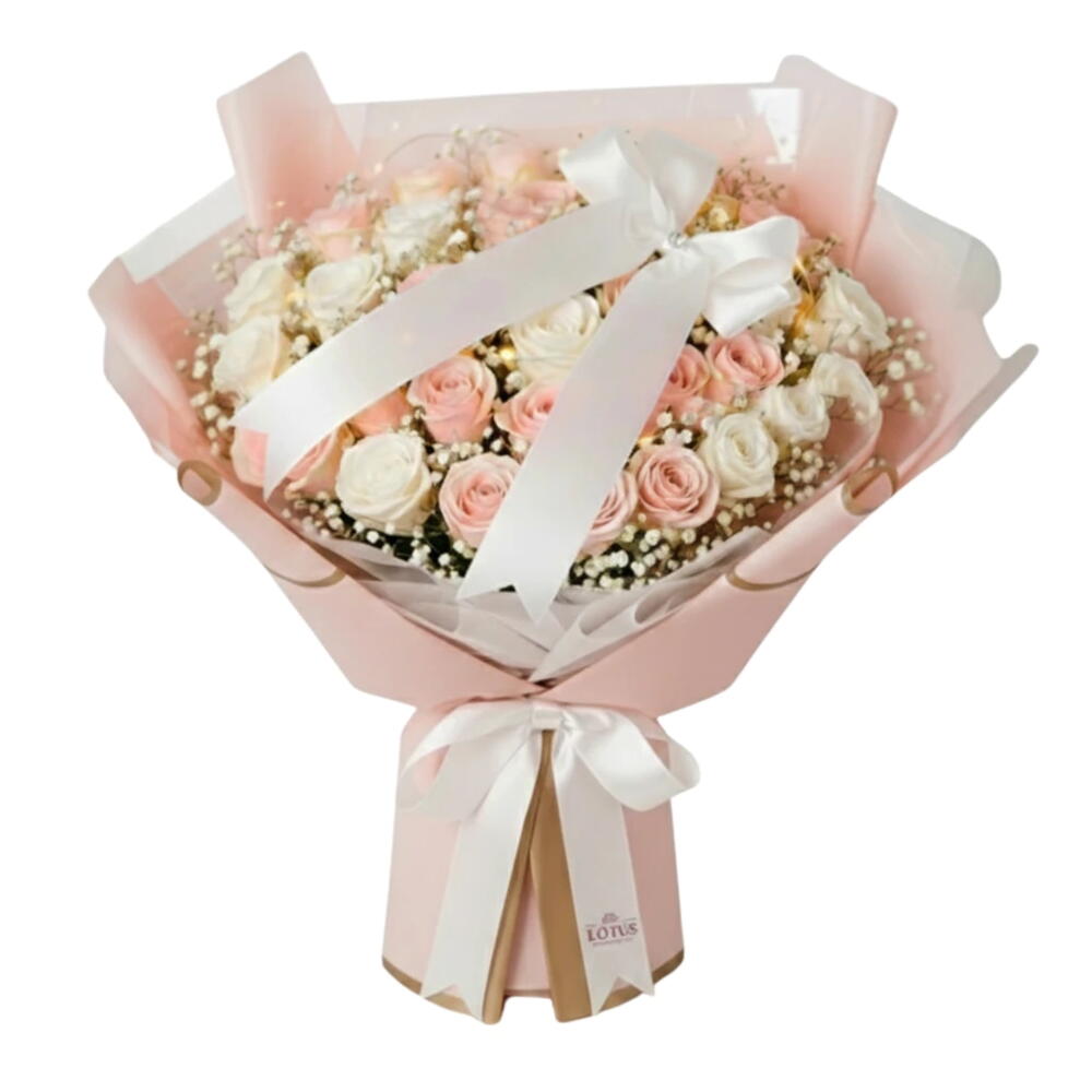 36 rosa — sendo 18 rosa rosa e 18 rosa off-white - 1 un. complemento com gypsophila (mosquitinho) - 1 un. embalagem premium em papel coreano rosa e acetato transparente - 1 un. laço de cetim branco com detalhe em strass - 1 un. fio de led com luz amarela suave entre as flores - 1 un.