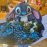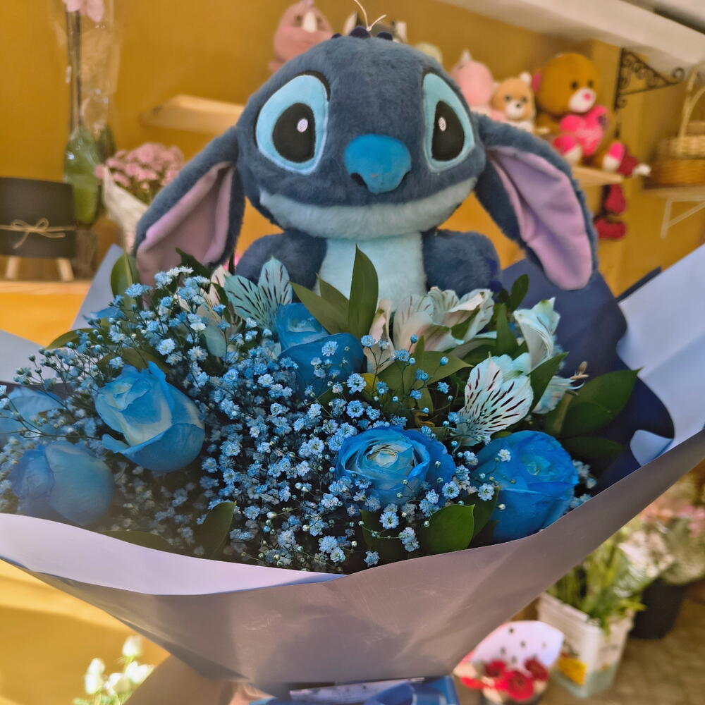 embalagem - 1 un. laço - 1 un. rosa azuis - 10 un. stitch 22 cm - 1 un. astromelias e complementos (hastes) - 10 un.
