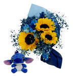Este encantador buquê é composto por uma embalagem única, trio de girassóis vibrantes e dez unidades de delicada gipsófila. A surpresa especial vem com a adição de um adorável boneco do Stitch de 20 cm, proporcionando um toque de originalidade e fantasia. Perfeito para presentear alguém especial ou apenas para adicionar um pouco de diversão a qualquer ambiente.