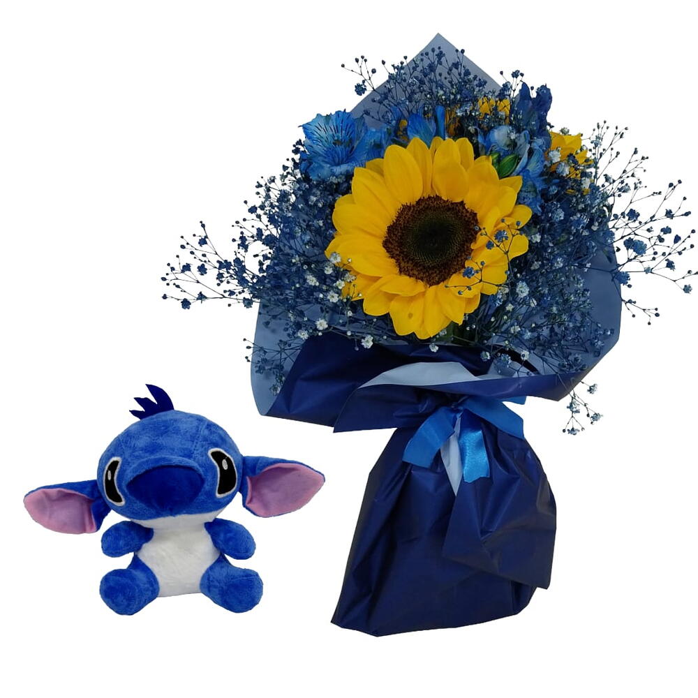 Buquê de 1 Girassol com boneco do Stitch Produto especial para o Dia das Crianças e para os adultos que são fãs do filme