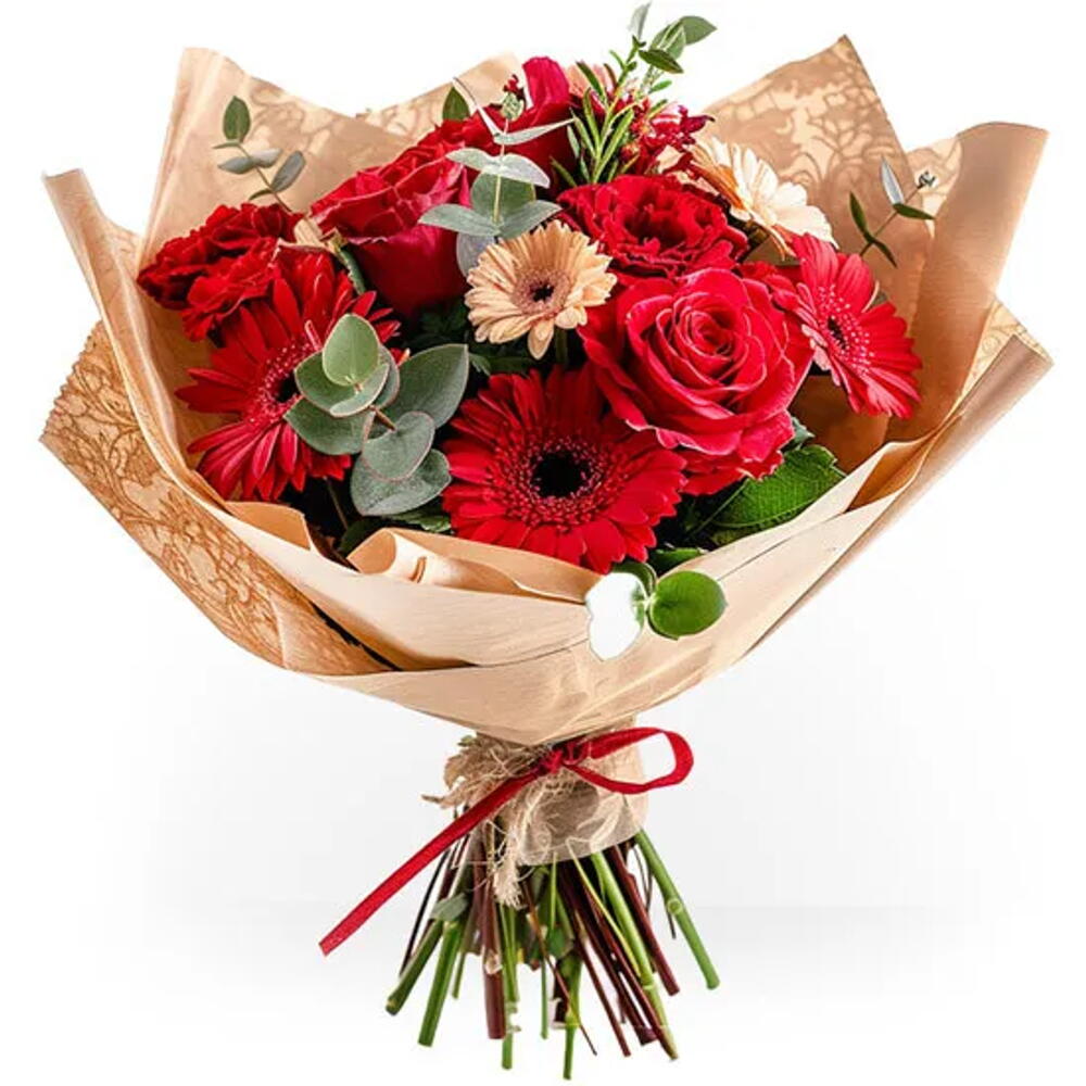 Este charmoso buquê é uma verdadeira explosão de cores e sentimentos. Composto por 6 gerberas vermelhas, que simbolizam a paixão, 6 gerberas chá, que expressam a beleza e admiração, e 6 rosas vermelhas, conhecidas como símbolo do amor profundo. A composição é harmoniosamente completada por uma elegante folhagem verde, que traz frescor e vitalidade ao arranjo. O buquê é finalizado com um toque de classe, cuidadosamente envolto em papel celofane e finalizado com um sofisticado laço. É o presente perfeito para demonstrar amor, respeito e admiração em qualquer ocasião.