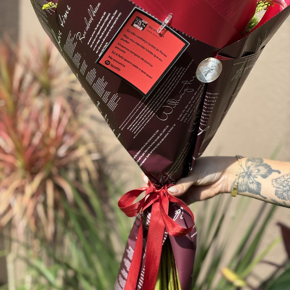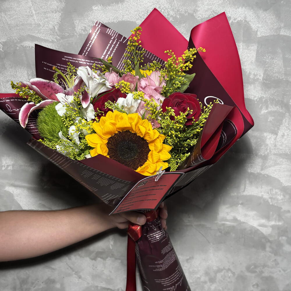 Encante com este lindo buquê, composto por 4 rosas delicadamente arranjadas, complementadas por um laço singular para adicionar charme e elegância. Acompanhadas por folhagens frescas, esta combinação é realçada pela singular impressão de fotos, que adiciona um toque especial e pessoal à composição. A maravilha do buquê é intensificada com a inclusão de 2 alstromélias variadas, além de exuberantes girassóis frescos e radiantes. Complementados por lírios vibrantes em tons de laranja e 2 elegantes hastes de astroméria selecionadas, este arranjo é uma verdadeira sinfonia de cores e fragrâncias. Finaliza-se com uma embalagem presenteável premium, tornando esta peça não só um presente, mas uma experiência memorável para quem o recebe.