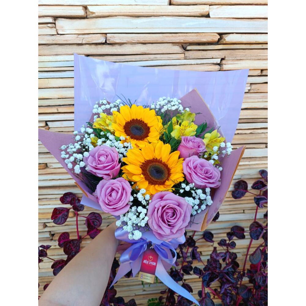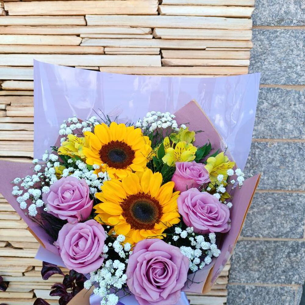 Este deslumbrante buquê é a perfeita união de 2 girassóis vibrantes, 5 rosas lilás, suavemente complementados por uma astromelia, um tango, uma feminina gypisophila e um aspargo nobre. Tudo delicadamente envolvido em papel lilás e finalizado com um laço elegante. Uma escolha magnífica para iluminar o dia de alguém especial ou acrescentar um toque de charme a qualquer ocasião.