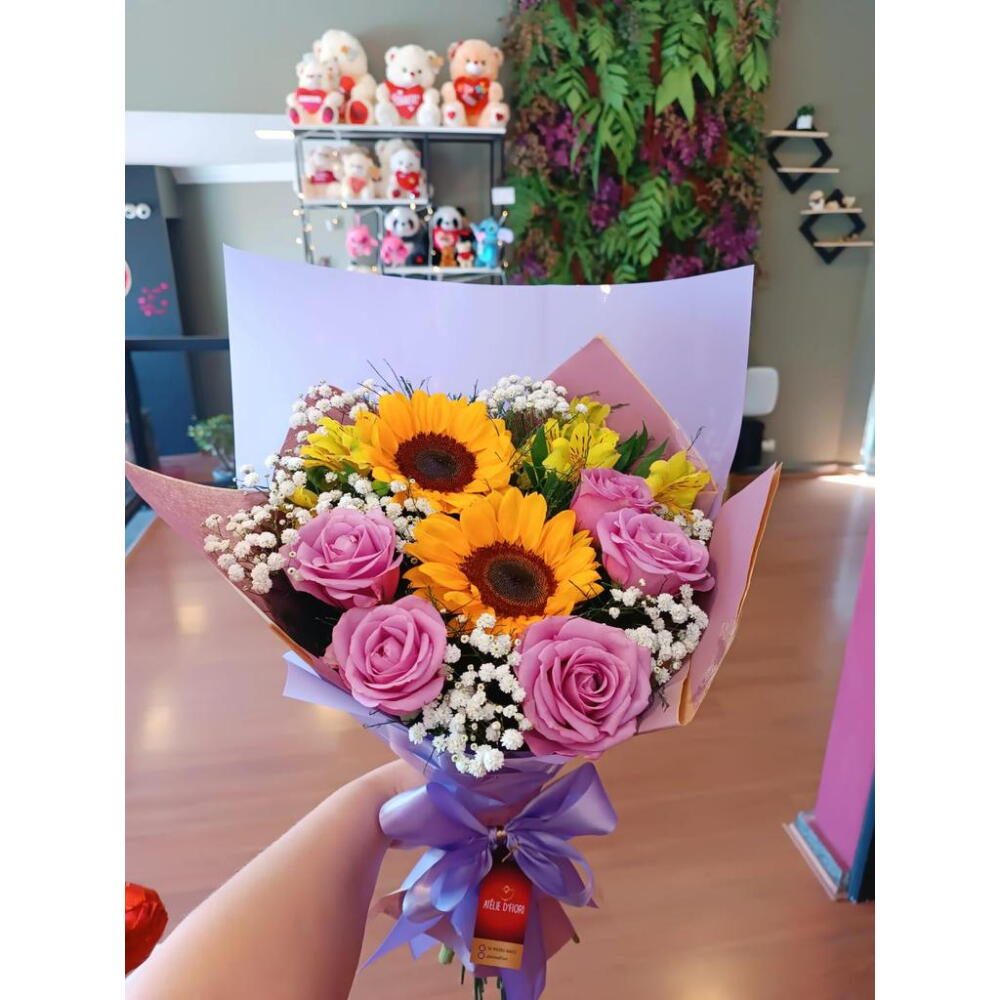 tango - 1 un. girassol - 2 un. aspargo - 1 un. astromelias - 1 un. rosa lilás - 5 un. gypisophila - 1 un. embrulho delicado lilás com laço - 1 un.