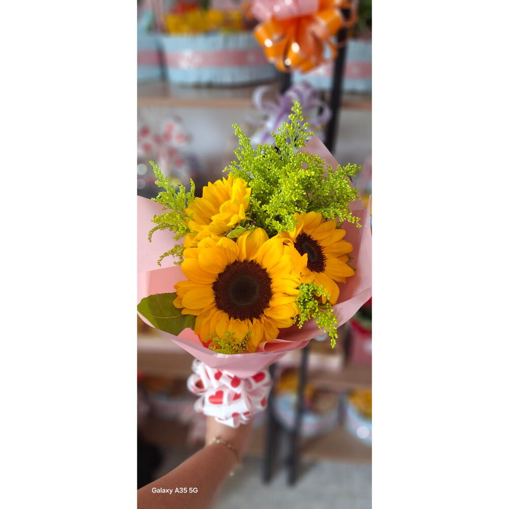 Experimente a alegria radiante deste lindo buquê composto por três peças de folhagens elegantes, três girassóis vibrantes, tudo bem embalado em uma elegante embalagem com um laço charmoso. Ideal para trazer um toque de natureza e cores alegres para o seu ambiente ou como um presente cheio de afeto e apreço. Agora você pode desfrutar da beleza dos girassóis em qualquer época do ano com este excelente buquê.