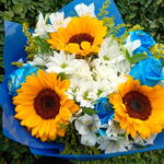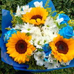 folhagem - 5 un. girassol - 3 un. astromelias - 6 un. rosa azul - 3 un. margarida branca - 4 un.